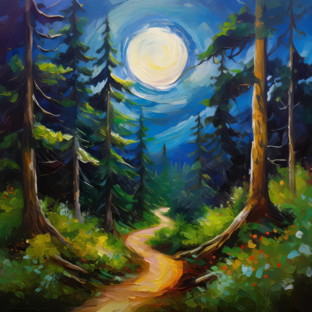 A moonlit path leads through the boreal jungle, illuminating a trail flanked by towering evergreens and thick underbrush.