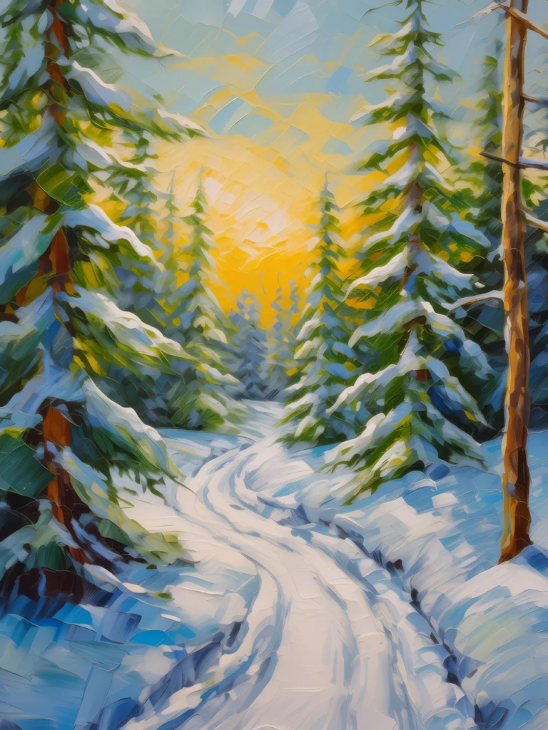 A snow-covered trail winding through a boreal forest, surrounded by tall evergreen trees.
