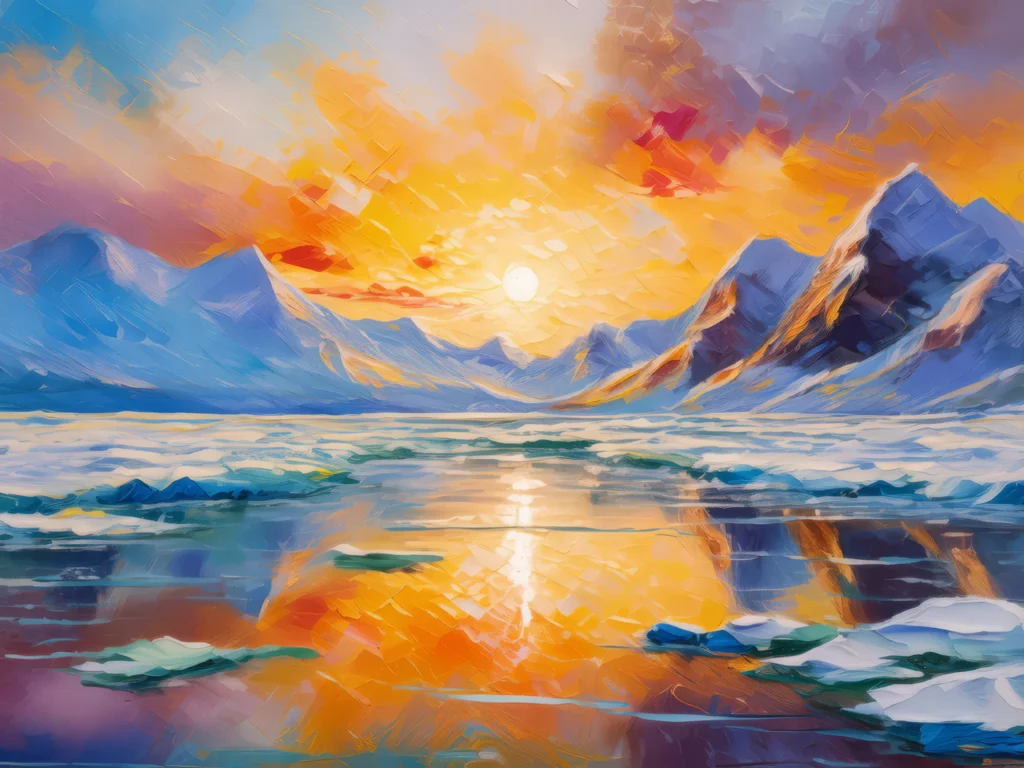 The sun sets, casting a shimmering reflection across a frozen lake in the arctic desert.