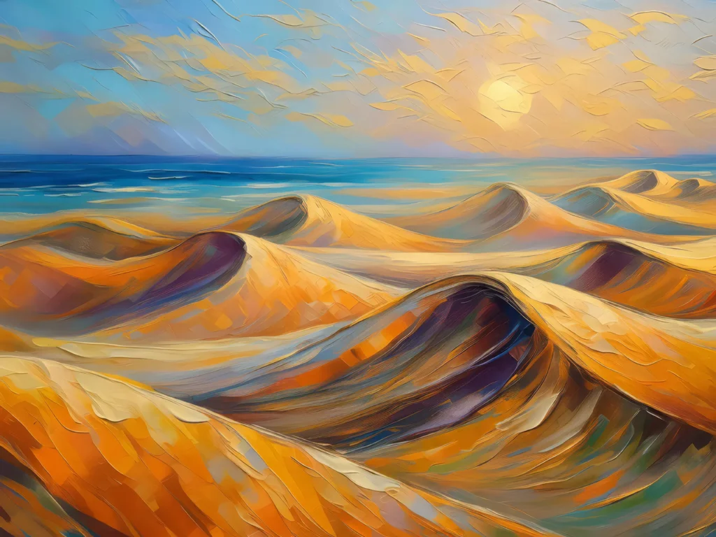 A temperate grassland landscape captured in the style of an impressionist painting, with soft brushstrokes and vibrant colors.