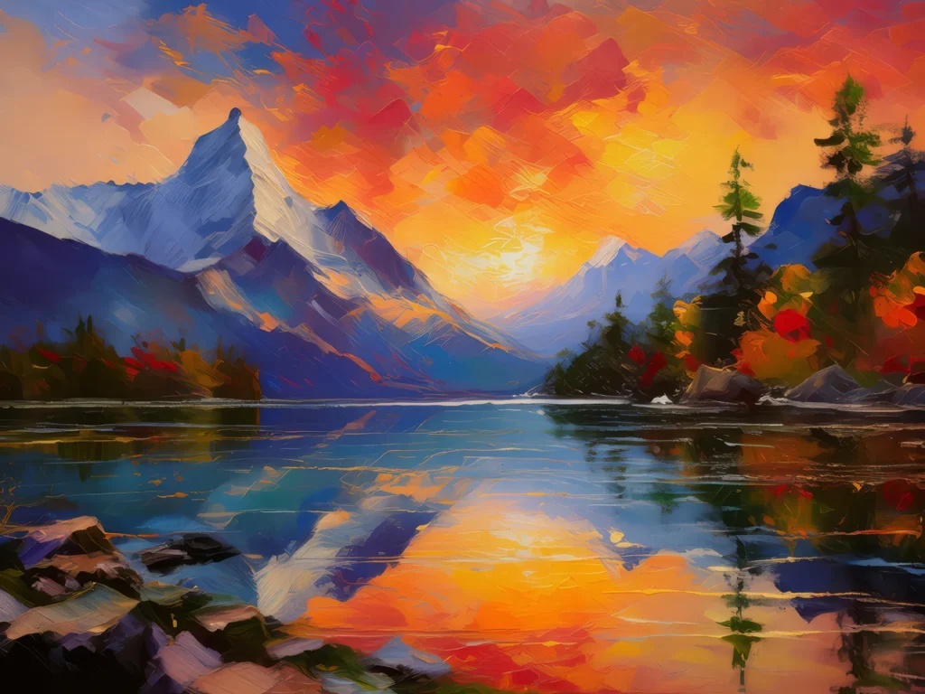 A tranquil mountain lake at sunset, reflecting the fiery hues of the sky and surrounded by silhouetted peaks