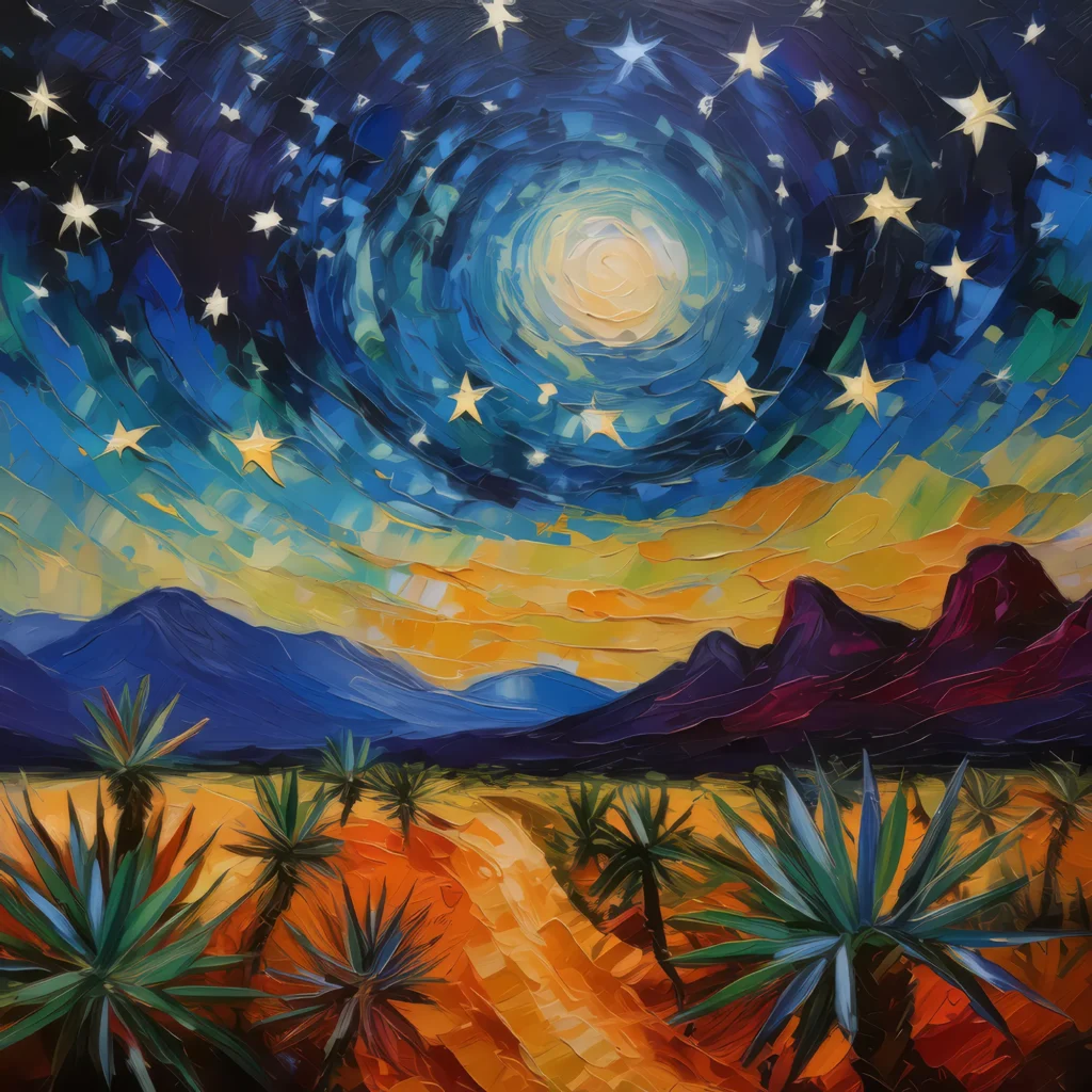 A star-filled sky over the desert mountains, creating a serene nighttime scene.