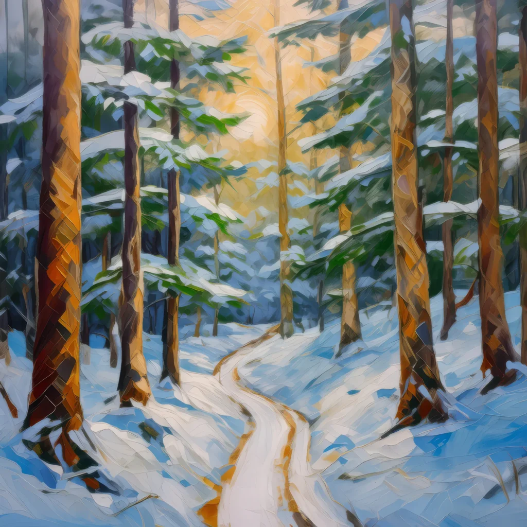 A snow-covered path winding through a quiet winter forest, with tall trees on either side.