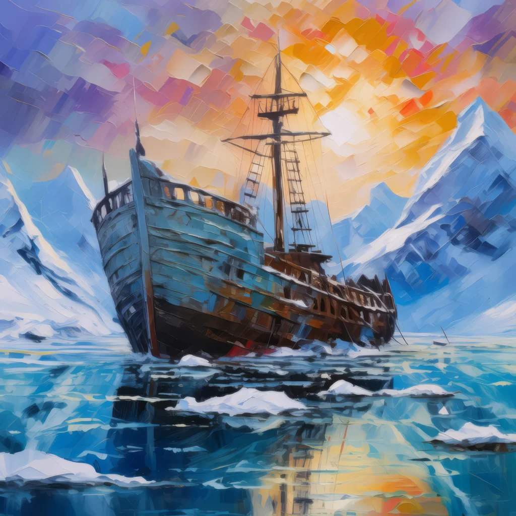 An old shipwreck frozen in the polar ocean’s icy waters.