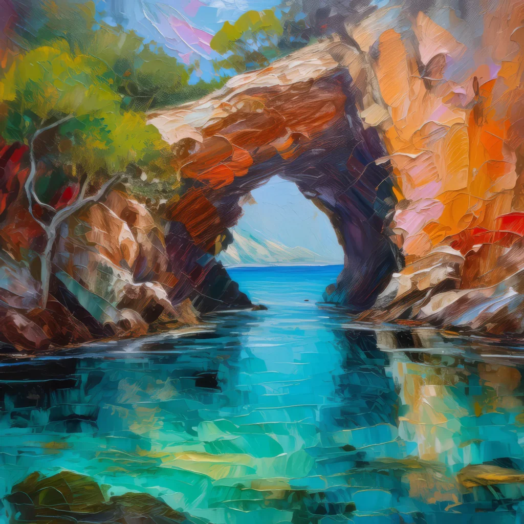 A hidden cave opening into a crystal clear lagoon, surrounded by rocky cliffs.