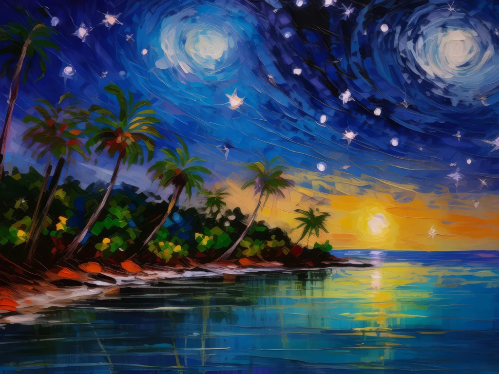 Starry night over a calm tropical ocean, reflecting the galaxy’s beauty.