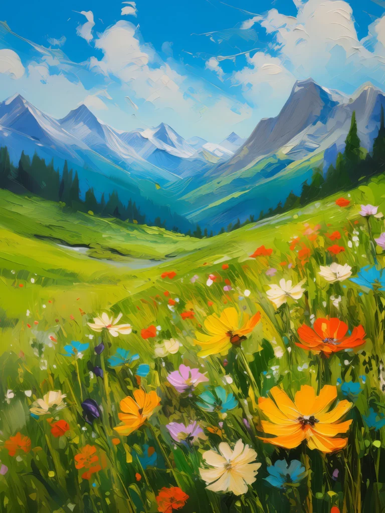 A lush summer alpine meadow with vibrant green grass and colorful wildflowers under a clear sky.
