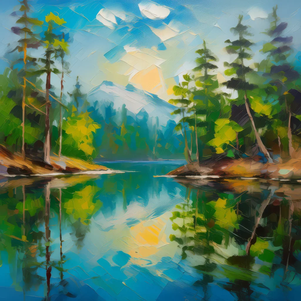 A still lake in the forest reflecting the surrounding trees and sky above.
