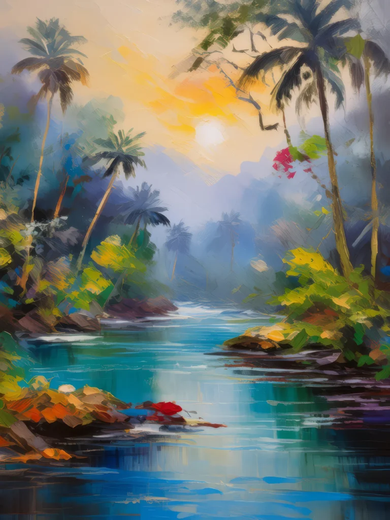 A serene river winds through a tropical jungle, shrouded in early morning mist.