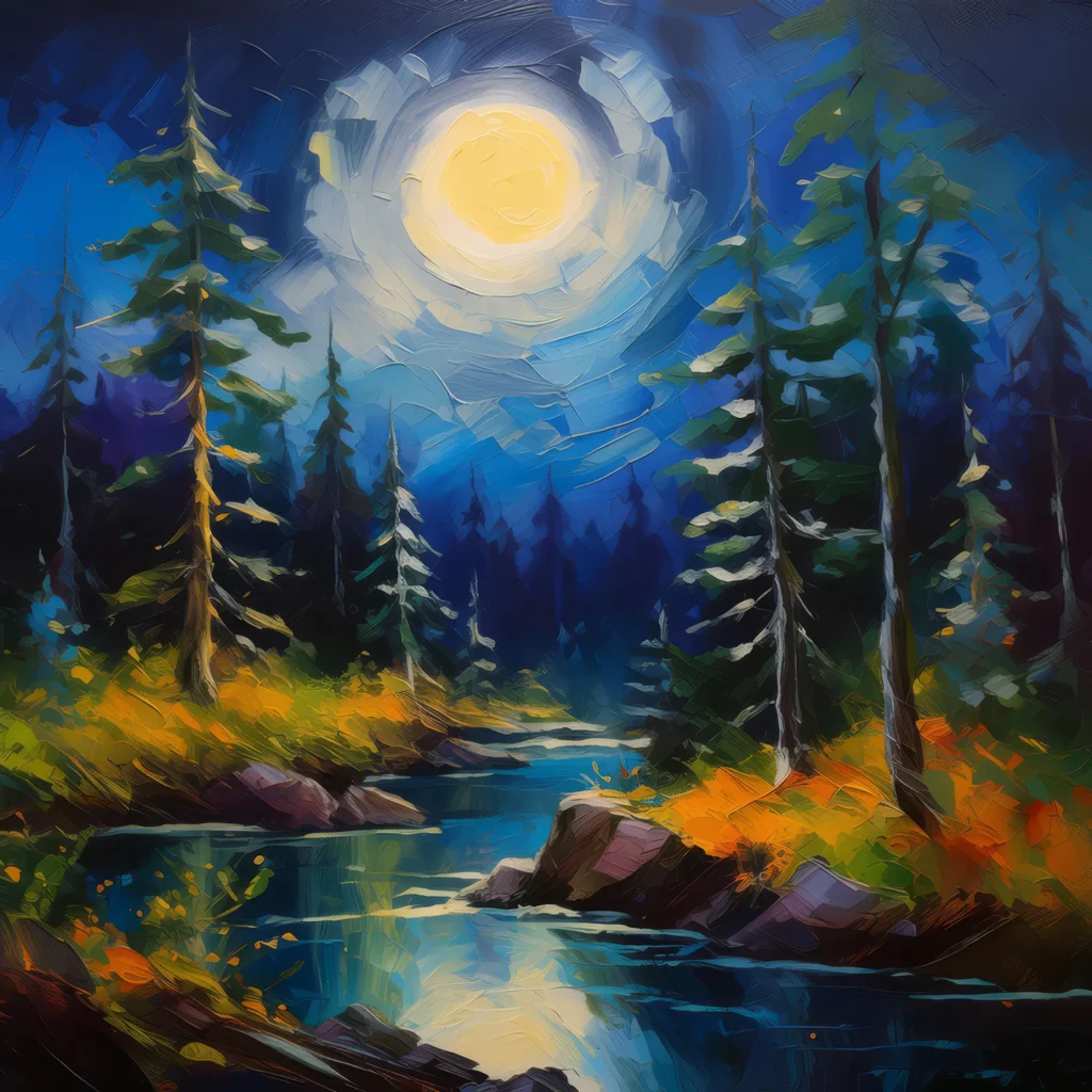 A boreal forest illuminated by the soft light of a full moon, creating a tranquil night scene.