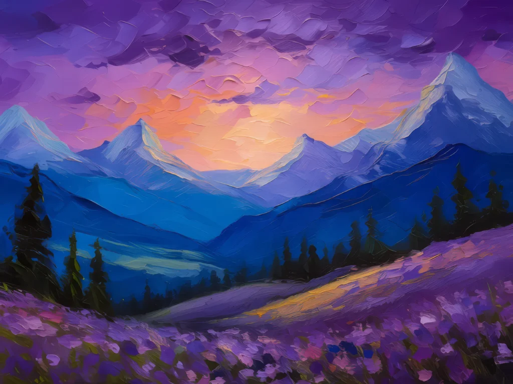 Twilight casting a purple hue over an Alpine valley, with distant mountains in silhouette.