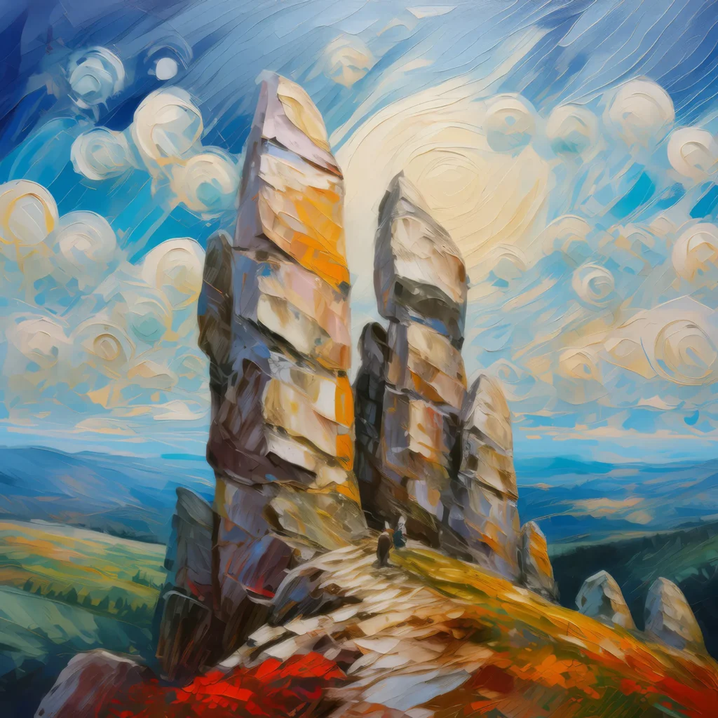 Enigmatic stone sentinels stand watch over an ancient crag, their weathered faces hinting at the enchanted secrets they guard.