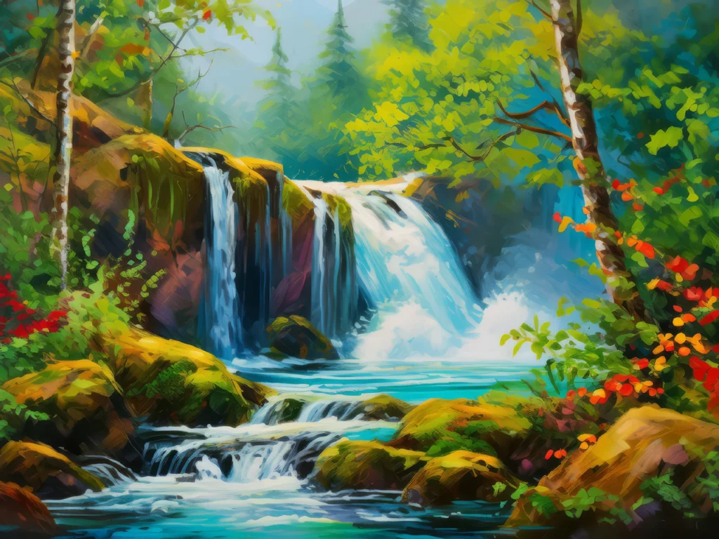 Waterfalls cascade through the boreal jungle, their powerful roar echoing among the dense growth and mossy stones.