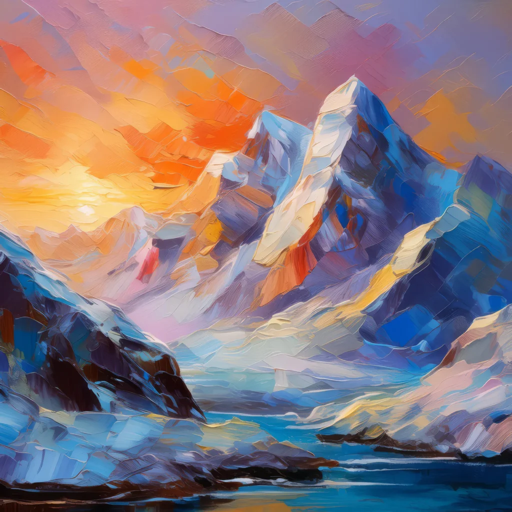 Arctic mountains at dawn with soft light illuminating the snow and ice-covered peaks.