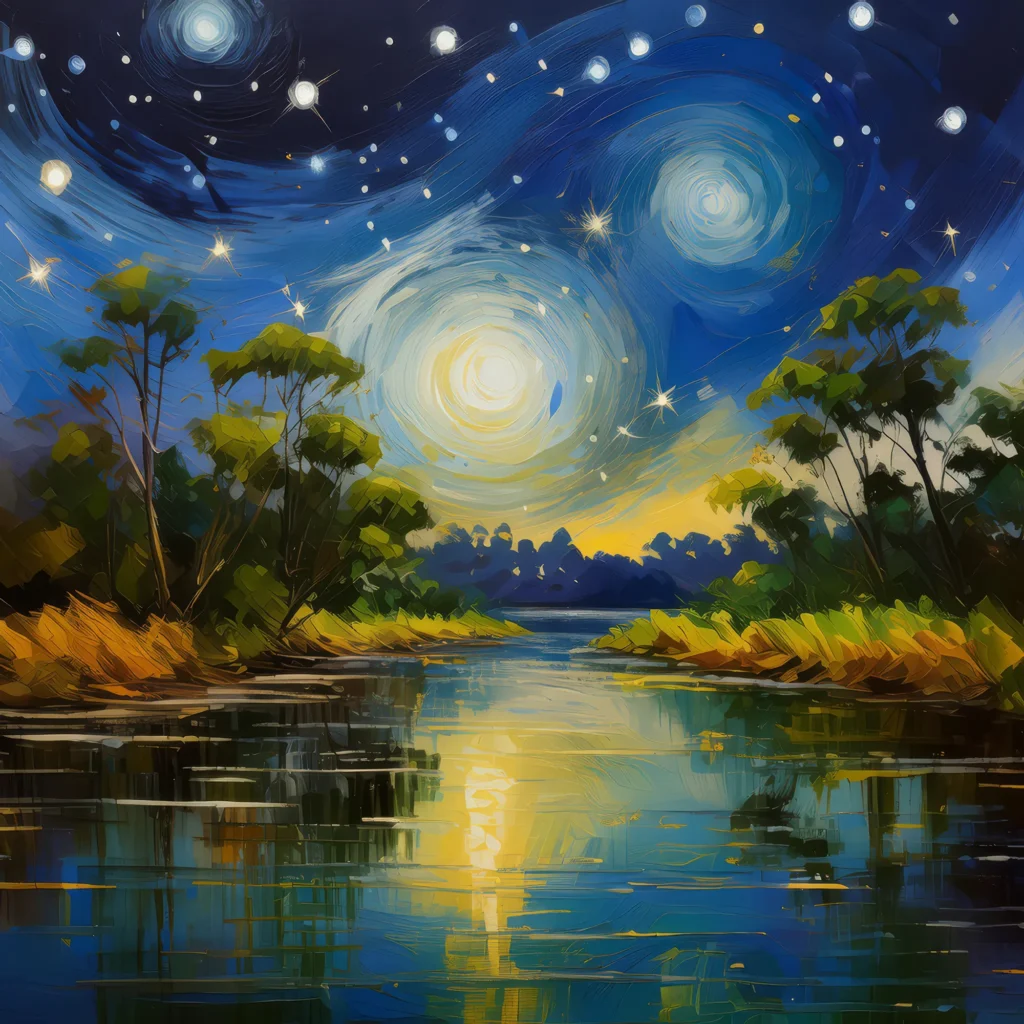 Under starlight, the river delta’s water mirrors the cosmos, revealing a quiet, reflective beauty.