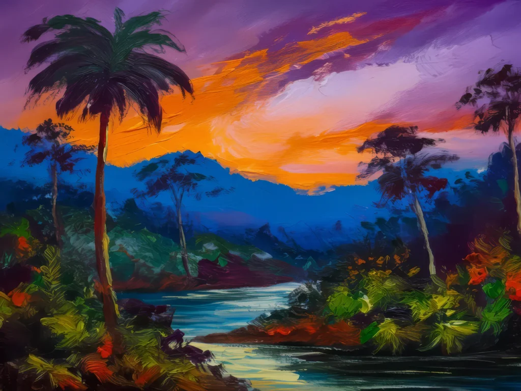 A tropical rainforest at dusk with the sky turning shades of purple and orange.