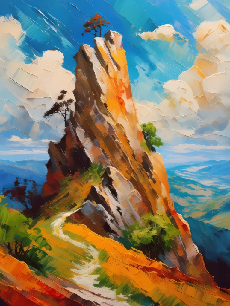Like a regal crown upon the landscape, a majestic crag presides over its rugged domain, a natural monarch of unrivaled grandeur.