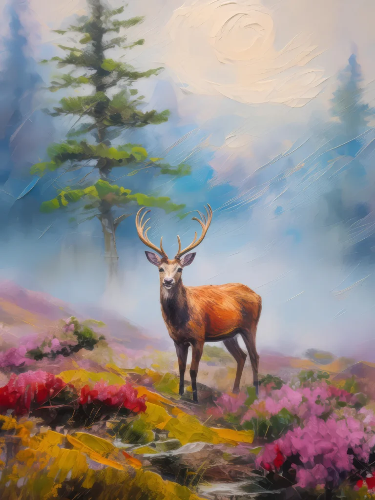A deer stands alert on a misty moor, early morning fog swirling around.