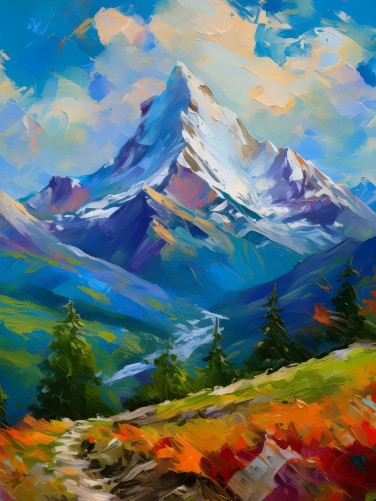 A majestic, snow-capped mountain range with a prominent crag, overlooking a lush valley below.