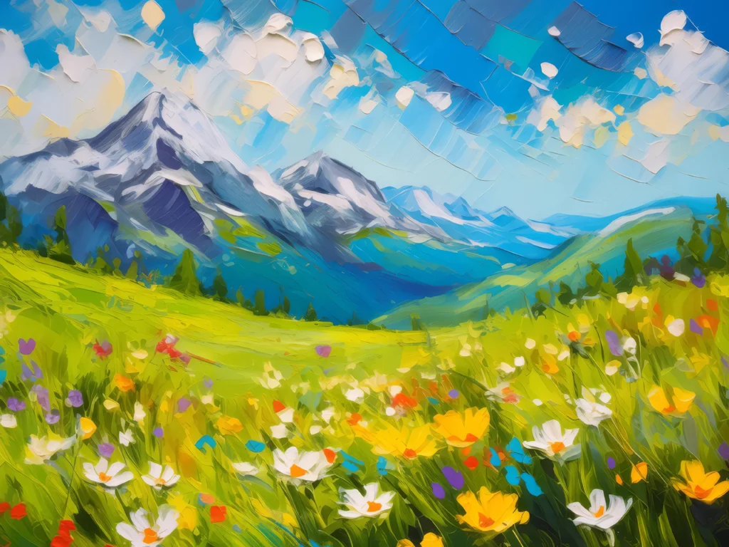 A lush spring alpine meadow with wildflowers, fresh grass, and a clear blue sky.