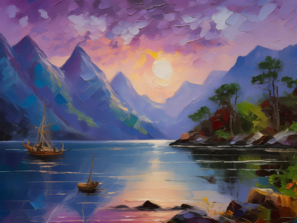As twilight settles over the fjord, the waters calm and the sky turns a soft shade of purple and blue.