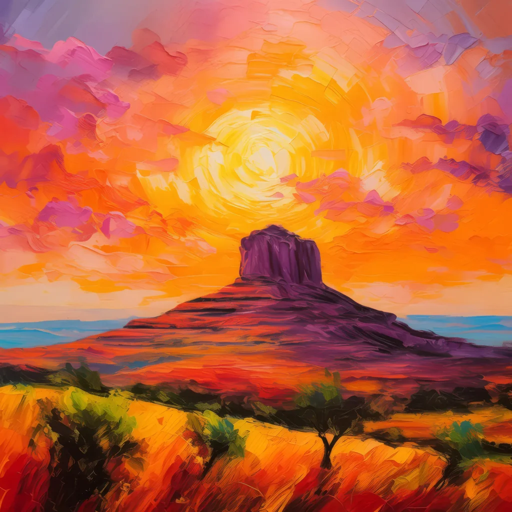 A mesa silhouetted against a vibrant sunset sky with warm orange and pink hues.