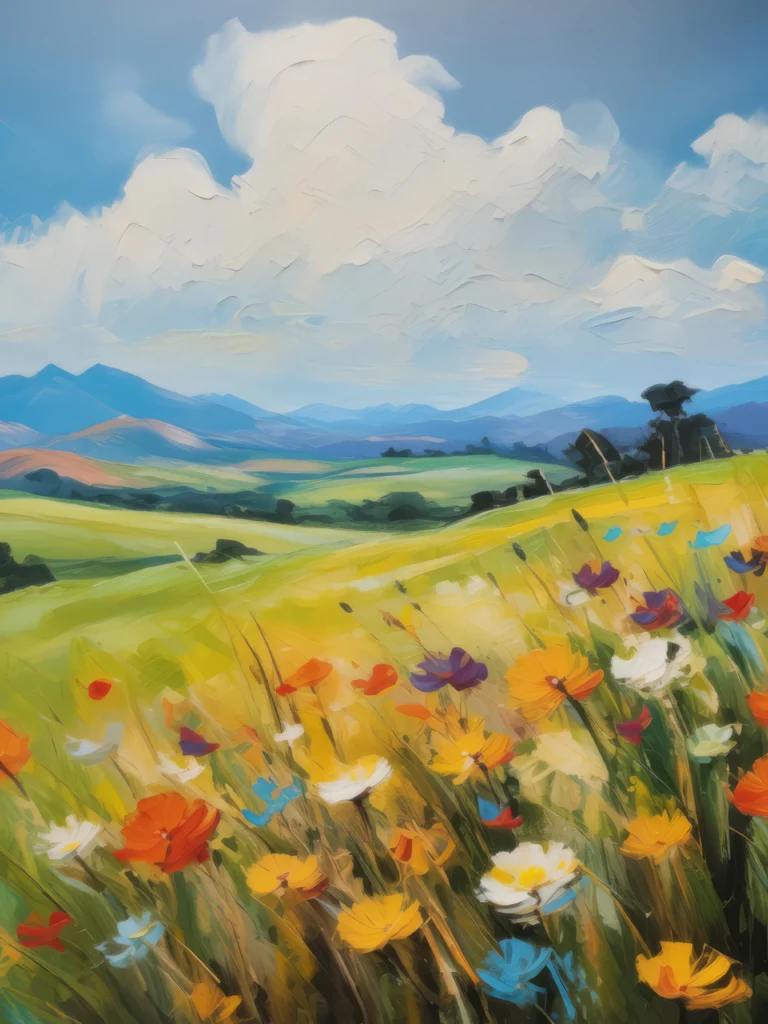 A vibrant grassland meadow filled with colorful wildflowers, under a clear blue sky.