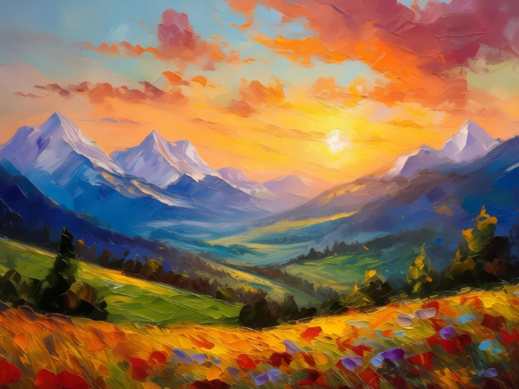 Sunrise over a serene alpine valley, with early light touching the mountain tops.