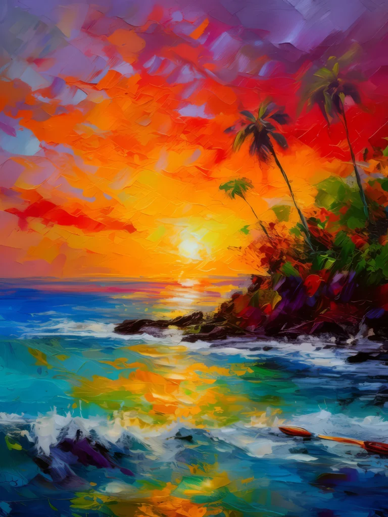 A fiery sunset casting brilliant colors across the sky over a calm tropical ocean.