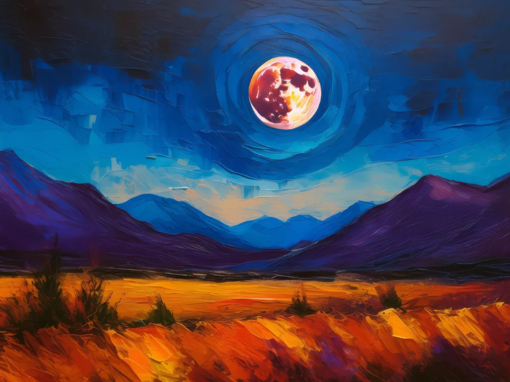 A lunar eclipse casts a mysterious glow over an alpine desert’s stark landscape.