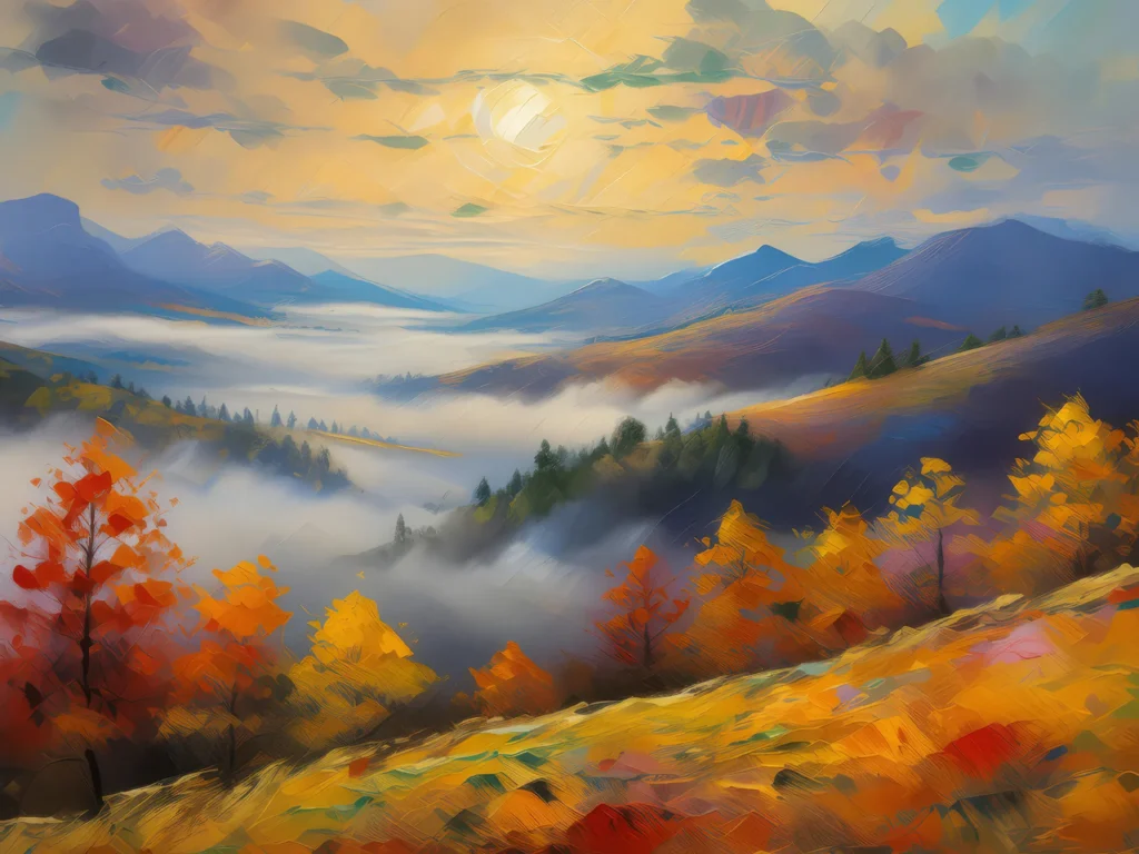 A dense fog settles over a plateau in autumn, creating a mysterious and ethereal atmosphere.