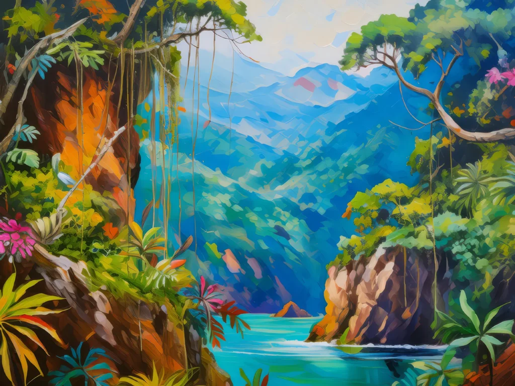 A chasm at the edge of a jungle cliff with cascading vines and exotic wildlife.