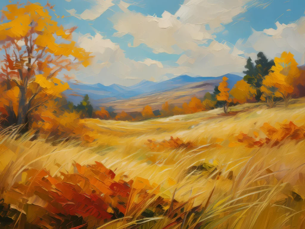 A scenic grassland in autumn, with golden grasses and vibrant foliage under a clear sky.