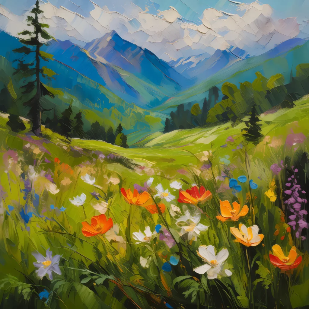 A temperate mountain meadow in spring, filled with blooming wildflowers and lush greenery.