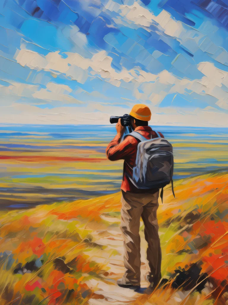 A photographer captures the vast, empty expanse of the tundra, under a cloudless sky.
