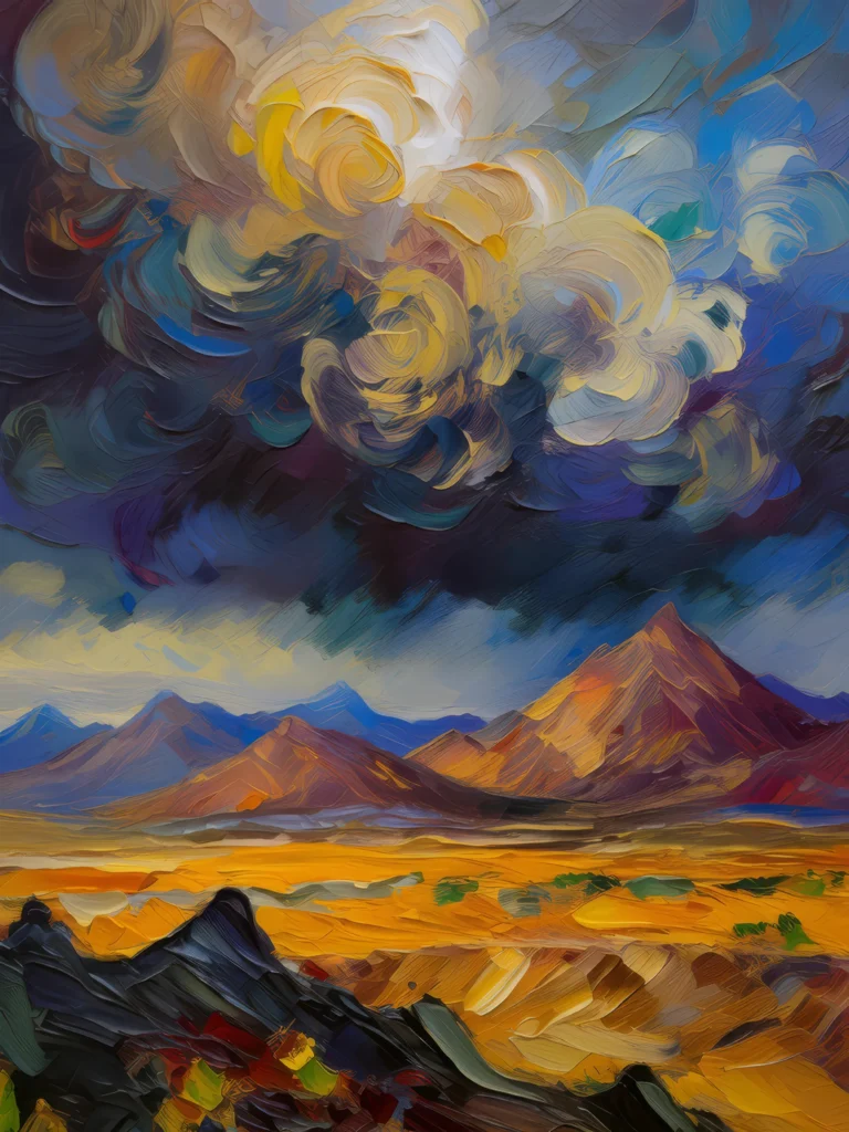 A brewing storm over desert mountains, dark clouds gathering ominously.