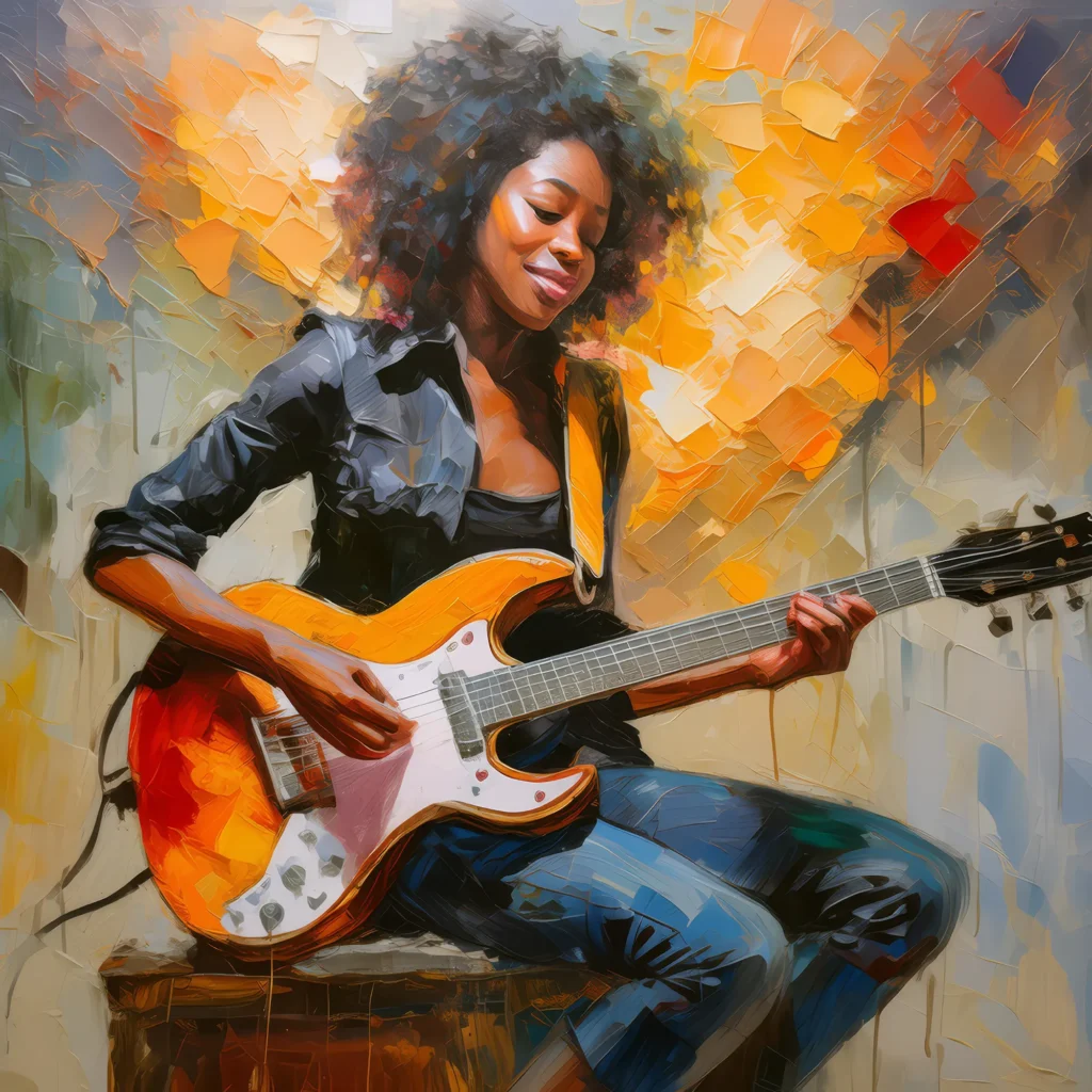 A rock guitarist in a home studio, playing a fiery solo on an electric guitar.