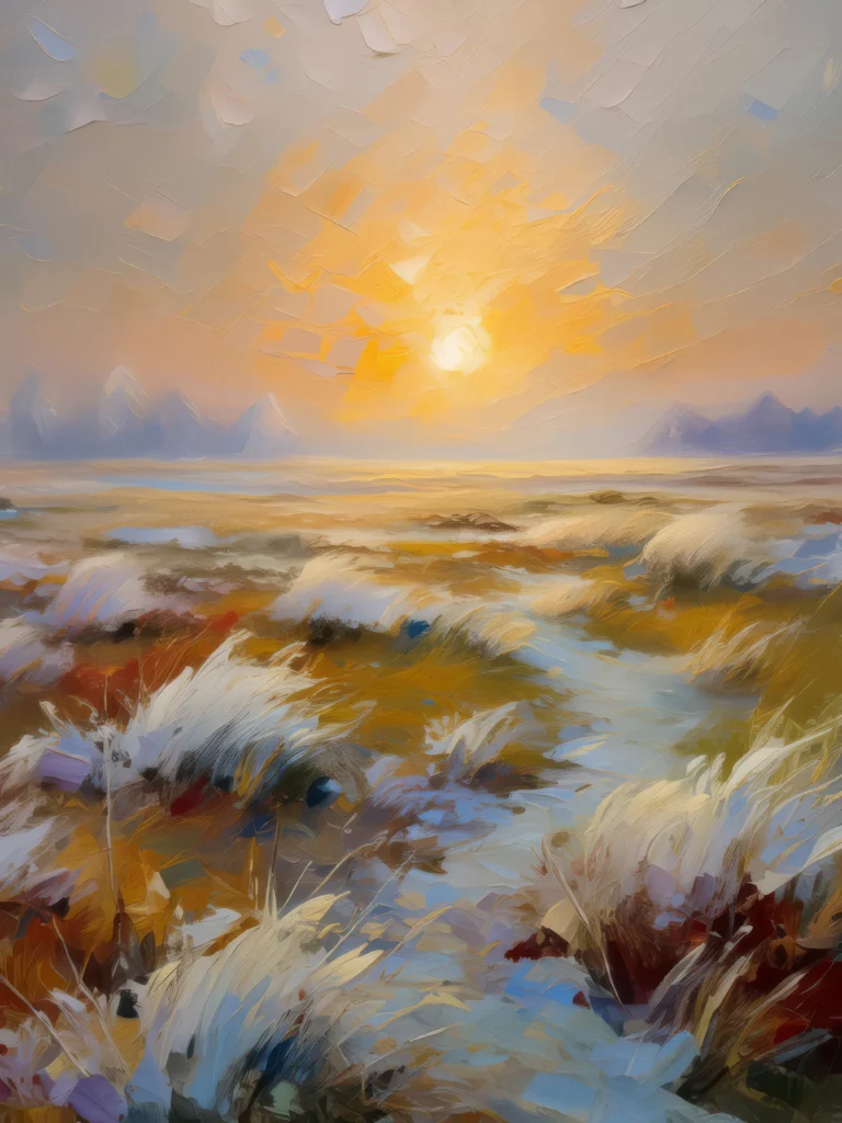 The first light of dawn illuminating an arctic grassland with frost and mist.