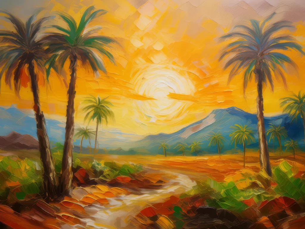 A beautiful sunrise casting golden light over the tropical desert with palm trees.