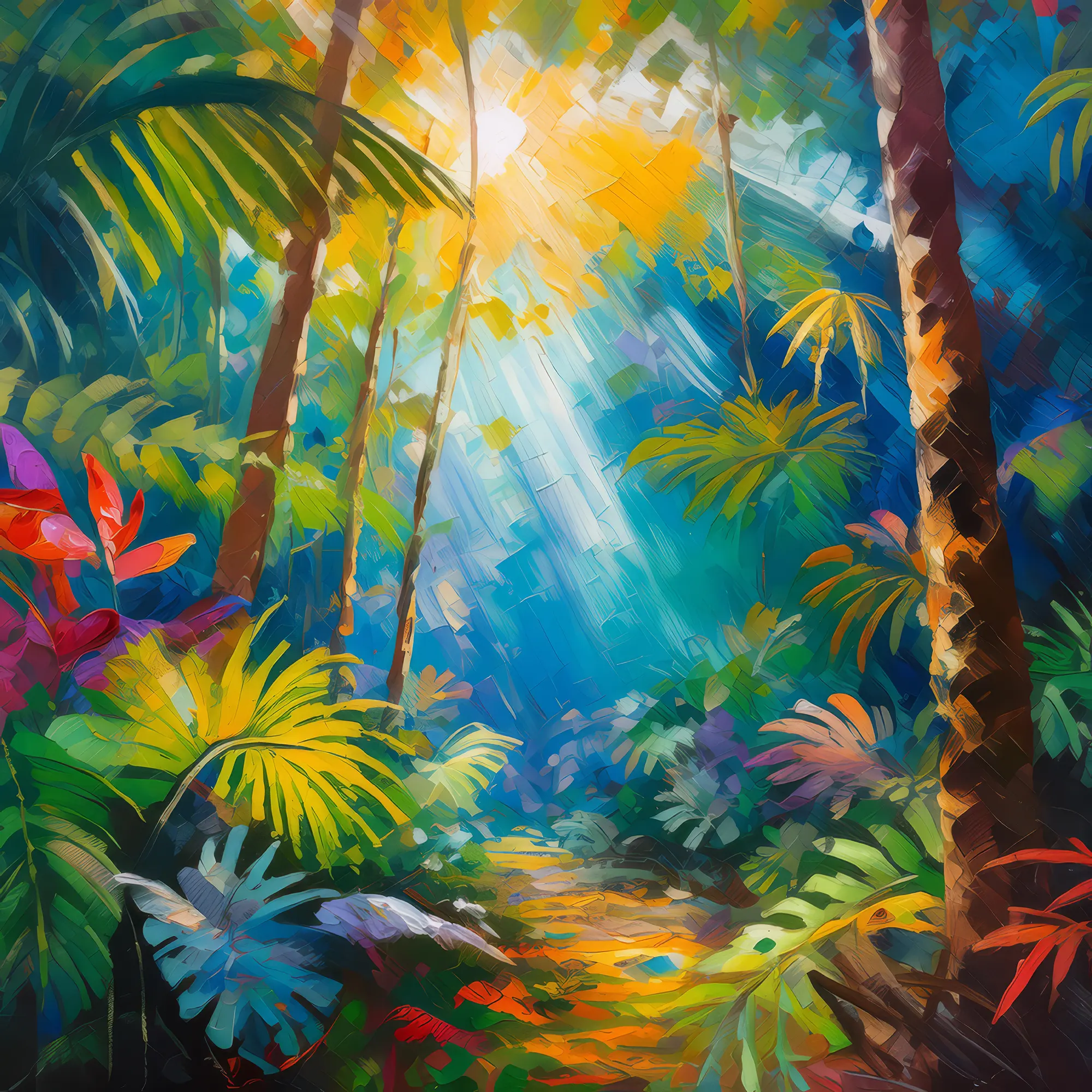 Canopy Shadows at NoonBy Emma Mickelberg / October 26, 2020 Noonday sunlight filters through the dense canopy of a vibrant tropical jungle. Painted in 2022. View ‘Canopy Shadows at Noon’ on Society6