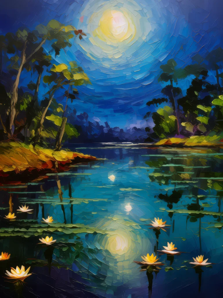 A peaceful lagoon illuminated by the moonlight, with reflections shimmering on the water.