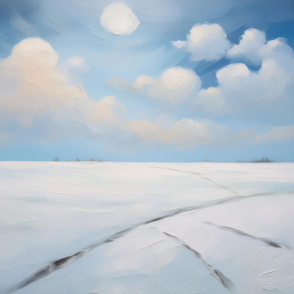 An endless snowy plain stretching to the horizon under a pale blue sky.