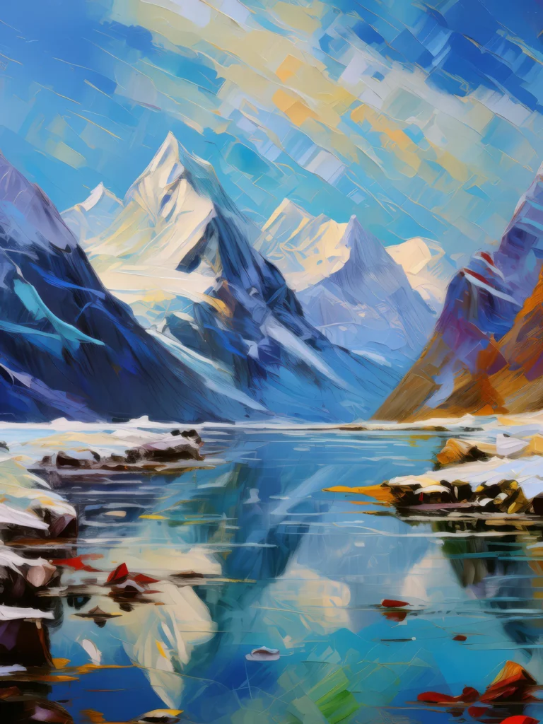 A serene frozen lake surrounded by towering Arctic mountains under a clear sky.