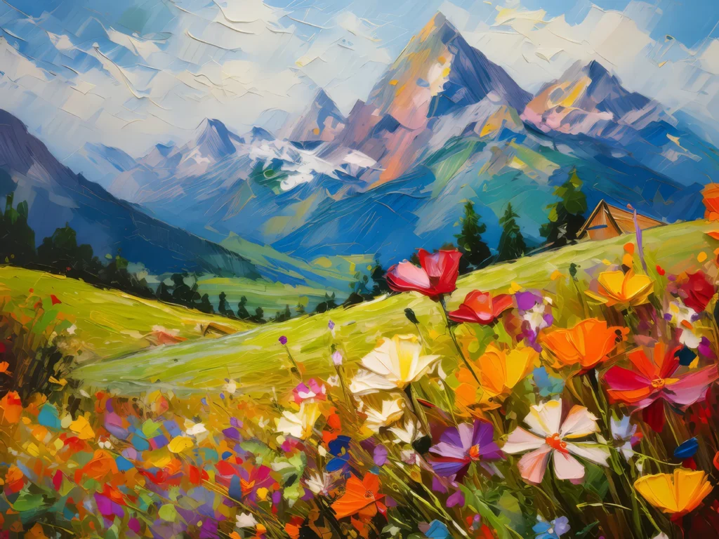 A field bursting with colorful wildflowers at the foot of towering alpine mountains.