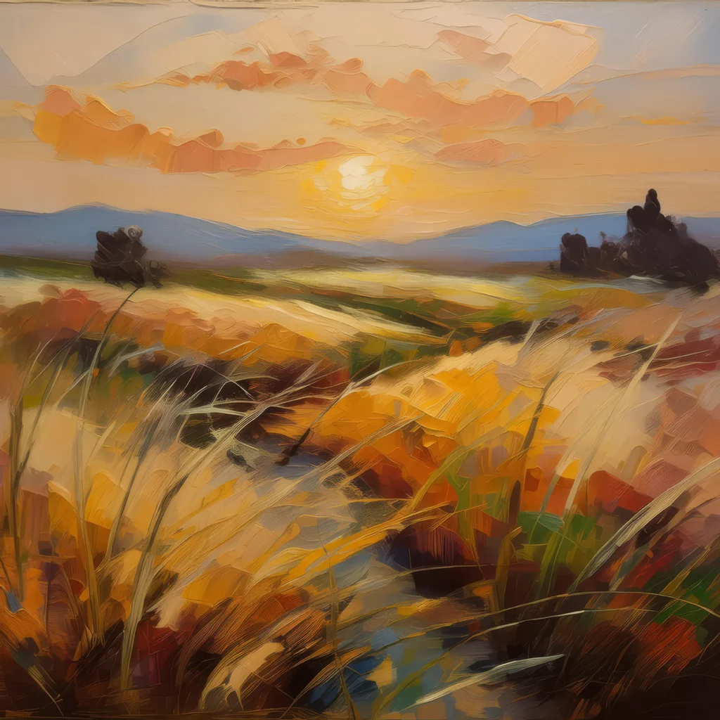 A peaceful prairie at sunset, with golden light casting long shadows over the grasses.