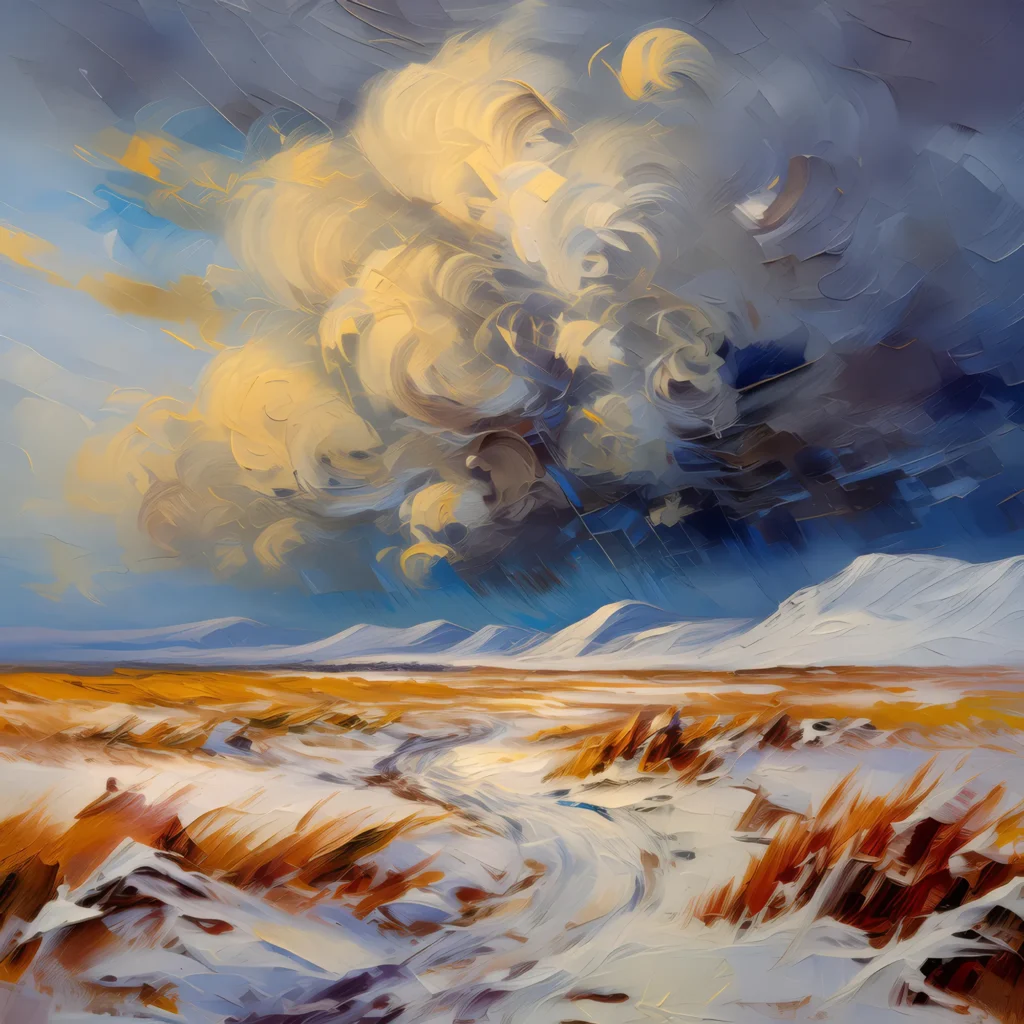 A barren polar desert with wind-swept snow and ice formations under a gray sky.
