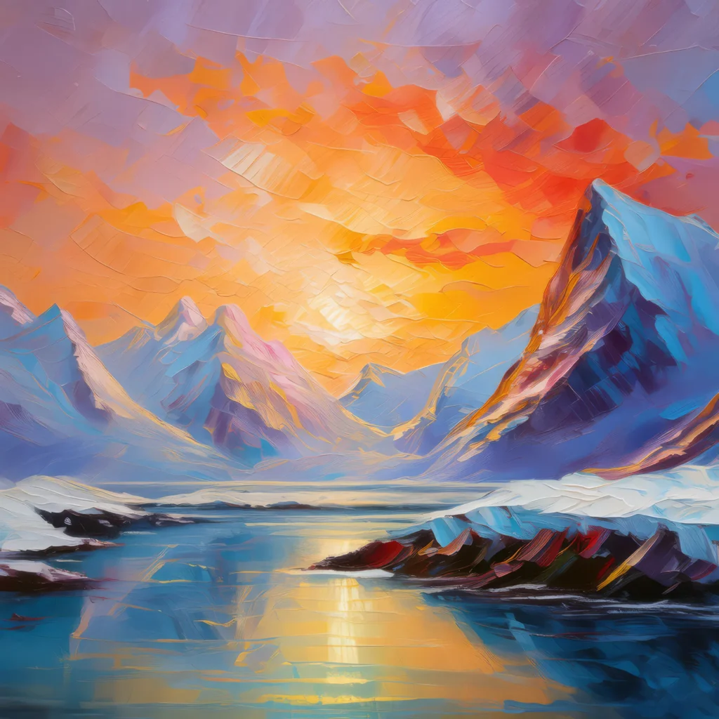 Arctic mountains at dawn, bathed in soft light, with snowy peaks glowing warmly.