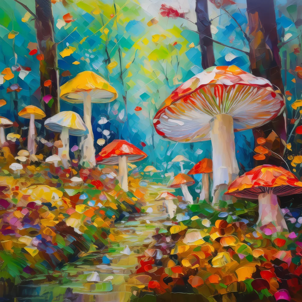 A forest floor covered in vibrant mushrooms of various shapes and colors.