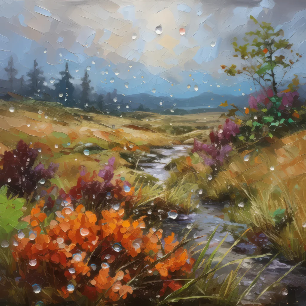 A rainy afternoon on the moor, with water droplets glistening on sparse vegetation.