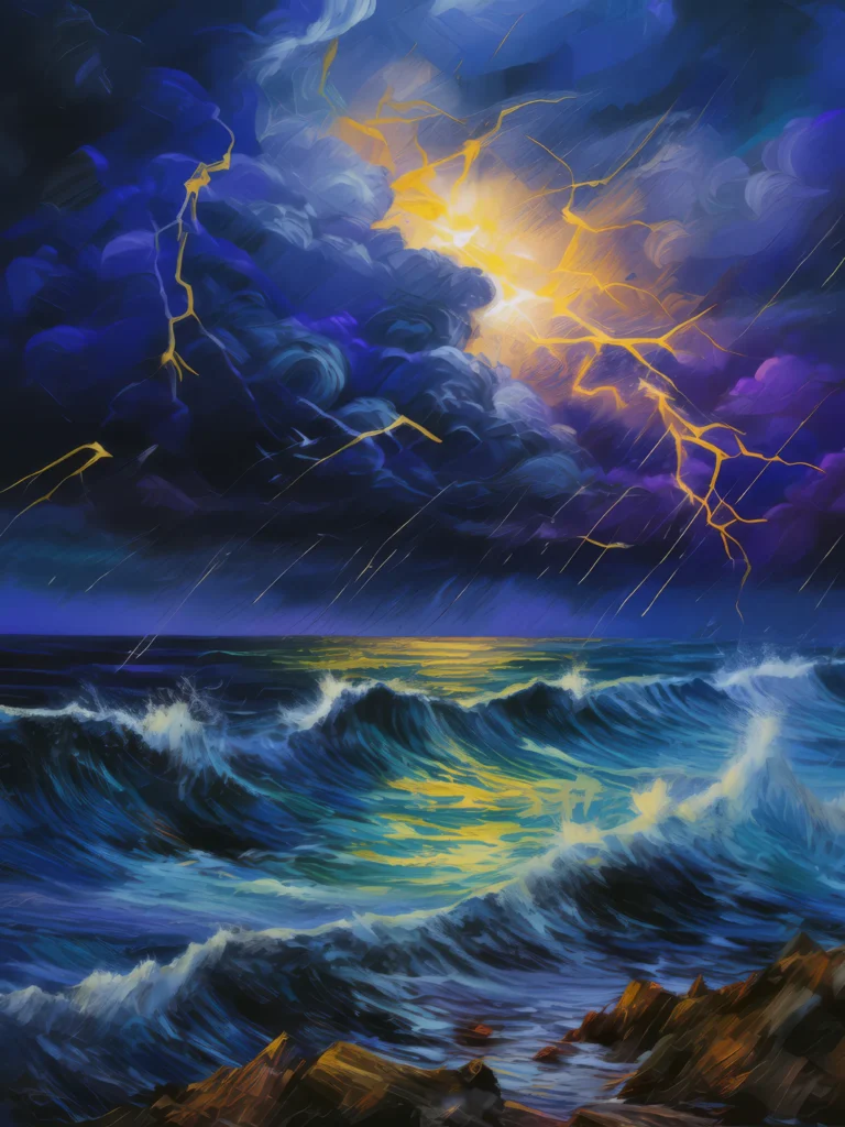 A stormy night over the ocean with lightning illuminating the dark waves and ominous clouds overhead.
